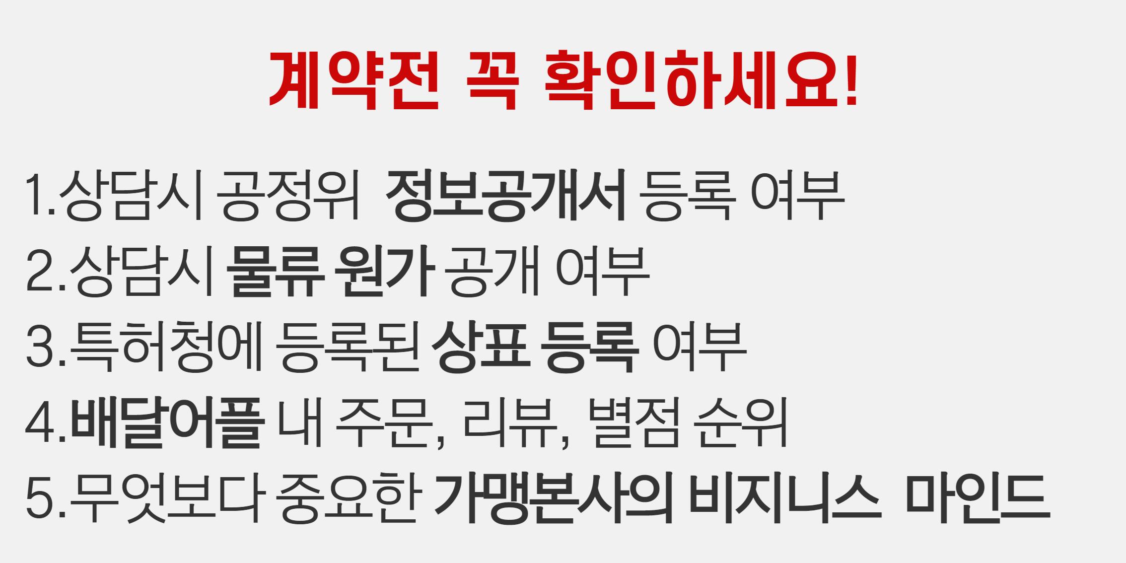육터닭은 1인 창업 배달전문점 브랜드 입니다. 경쟁력있는 메뉴개발과 구성으로 현재 전국에 23개의 가맹점을 확보했습니다. 육터닭의 수익구조의 원칙은 가맹점이 수익이 나지 않으면 본사도 수익을 가져가면 안된다 입니다.가맹점이 수익이 나지 않는데 본사가 수익이 난다면 그것은 사기지 프랜차이즈가 아닙니다.본사에서는 점주가 얼마의 수익을 창출할 수 있는지 확인할 수 있는 원가계산표를 제공하고 있으며 가맹점에 대한 최소한의 책임감을 가지고 운영하고 있습니다.